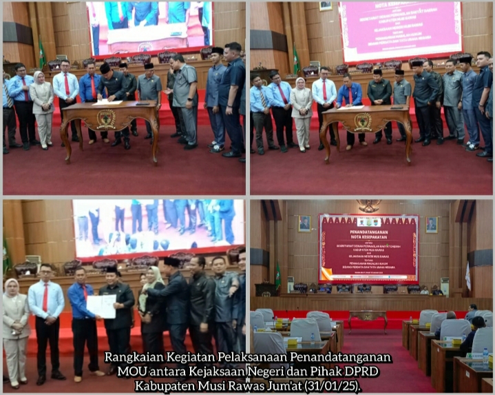 Musi Rawas, Verostv.com – Jumat (31/01/25) bertempat digedung DPRD Kabupaten Musi Rawas dan Pihak Kejaksaan Negeri Setempat, melaksanakan penandatanganan Memorandum of Understanding (MoU). Kesepakatan dilakukan kedua instansi ini berkaitan tentang penanganan hukum bidang perdata dan hukum tata usaha negara.